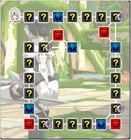 人物将从左上角第一个房间开始进行战斗,蓝色房间为时空之泉(奖励关卡),关卡不会出现BOSS怪,在这里玩家可以恢复HP和MP,得到特定的状态,而在赫尼尔时空副本中死去的队员可以自动复活,随后玩家可以选择是否继续游戏或终止游戏,退出副本无处罚,选择继续能获得更大奖励。
