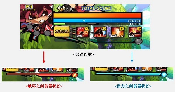 破坏剑士 当以具有活力属性的技能命令攻击怪物成功时(有HIT数出现),活力的能量会转化为破坏的能量,破坏的能量达到最大值时,艾索德就可变身为“破坏剑士”。“破坏之剑”可以增加破坏技能的攻击力,当被攻击时可以无视敌方的攻击,一定时间内进入霸体敌状态。破坏能量消耗尽时,“破坏剑士”变回正常效果。 艾索德的专属“剑之道”,小艾们你们崛起的时刻来临啦!速速尝试新系统带来的无限激爽感受吧!